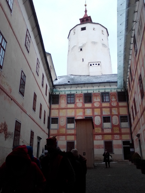 Der nette Busfahrer half allen beim Einsteigen und dann fuhren wir auch schon los. Nach gerade mal einer Stunde kamen wir bei der verschneiten Burg an. Zuerst stand das Essen auf dem Programm, das Serviceteam des Restaurant Grenadier servierte uns Kürbiscremesuppe, Schnitzel und Quinoa-Mangold-Strudel in einem extra für uns gerichteten Raum.